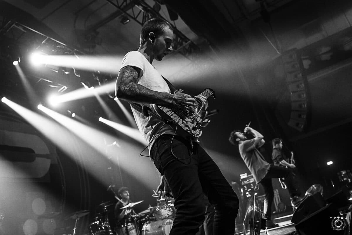 Après un bref répit, le public se dirige à nouveau vers le devant de la scène, certains s’accrochant jalousement aux crashs barrières pour ne rien rater de la performance, à l’occasion de l’arrivée des magiciens du metal progressif Periphery.