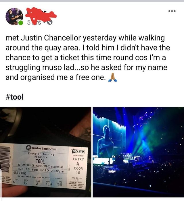 Un utilisateur de Reddit a posté un fil de discussion expliquant qu’un de ses amis était tombé sur Justin Chancellor, alors qu’il se promenait dans Sydney. Il a dit au bassiste qu’il était un grand fan. Justin lui a demandé s’il allait au concert de Tool ce soir-là. Le fan a ensuite expliqué qu’il ne pouvait pas y aller, parce qu’il est un musicien en galère.