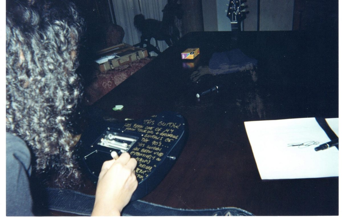 L’inscription au dos de la guitare, datée du 25 juin 2001, se lit comme suit :