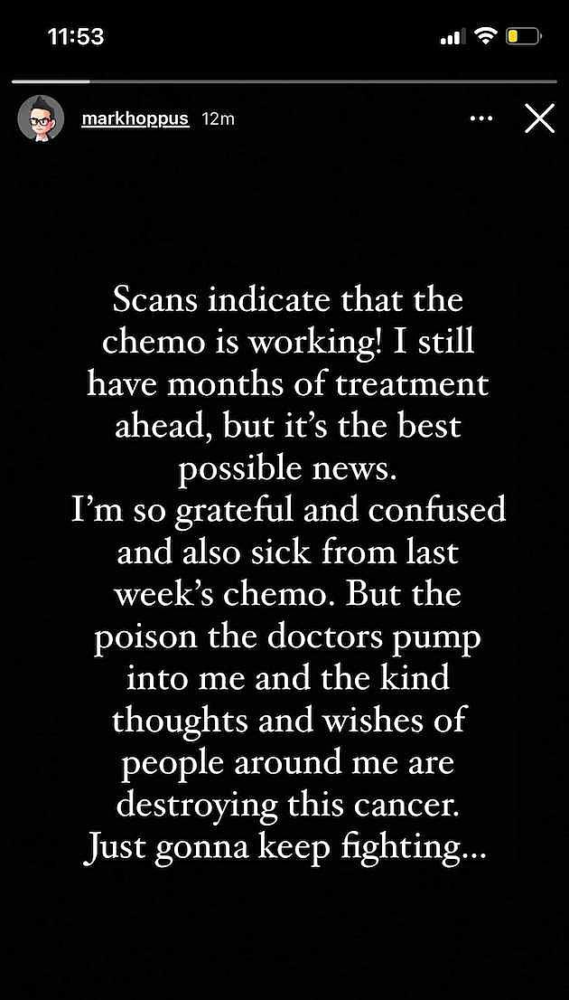 La chimiothérapie du bassiste et chanteur de Blink-182, Mark Hoppus, semble fonctionner et combattre efficacement son cancer, selon un nouveau message du musicien sur ses réseaux sociaux.