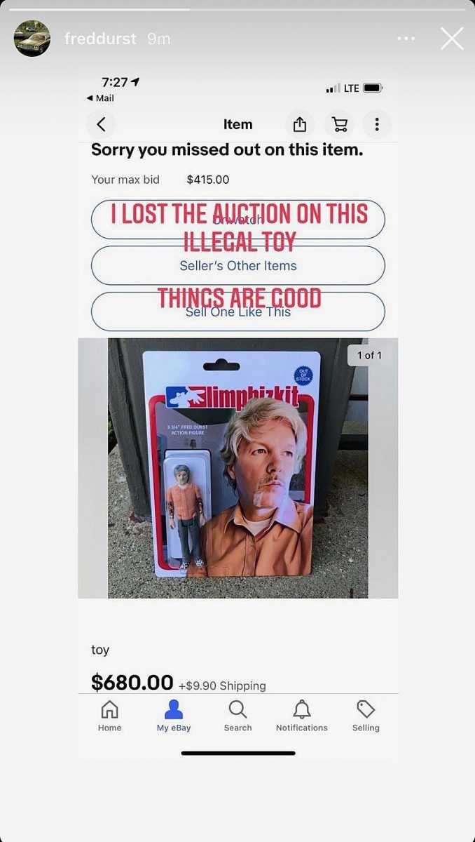 La vente aux enchères sur eBay s’est terminée lundi soir (9 août), et Fred Durst a révélé plus tard sur ses réseaux sociaux que son offre de 415 dollars avait été battue. Le jouet – vendu par l’utilisateur d’eBay outofstocktoys, vraisemblablement un objet unique – a finalement été vendu pour 680 dollars après un total de 54 enchères.