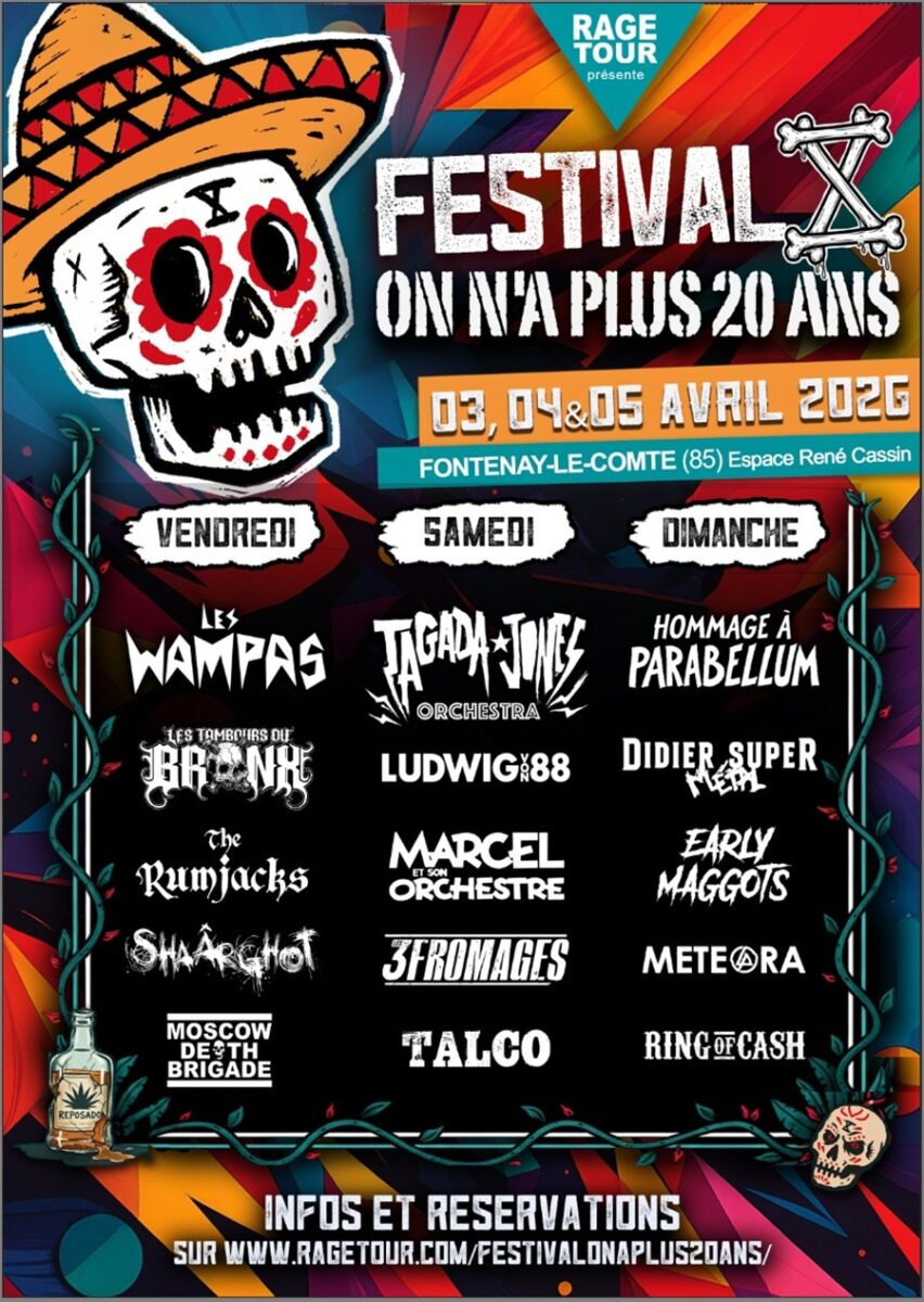 Créé par Tagada Jones et Rage Tour, le festival On N’a Plus 20 Ans s’est imposé au fil des années comme un rendez-vous majeur de la scène alternative française. Pour cette édition anniversaire, cinq groupes se succéderont chaque jour, du punk au metal, en passant par le ska et l’indus. Les billets sont disponibles via la billetterie officielle.