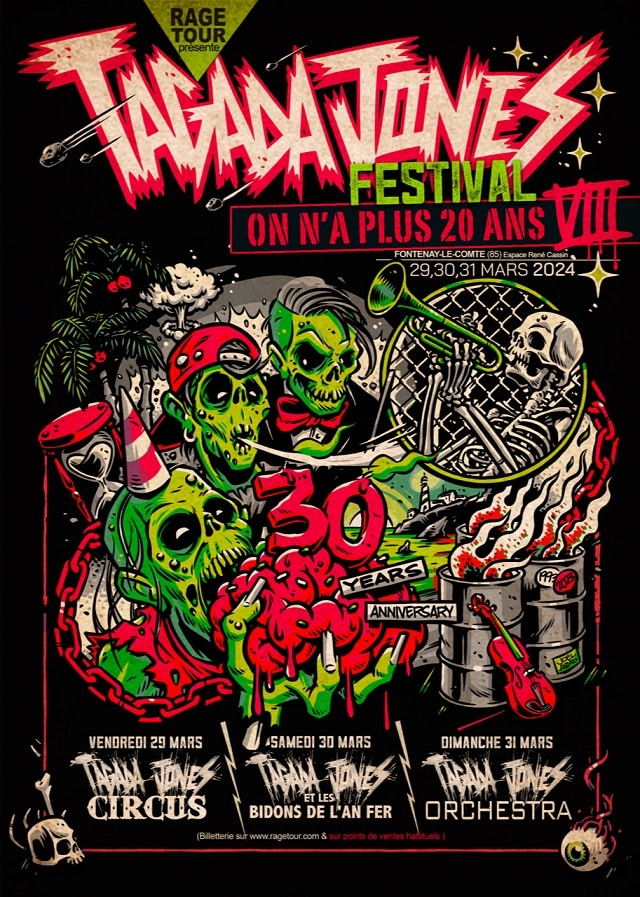 Cette huitième édition mettra à l’honneur les Tagada Jones, qui fêtent cette année leur 30e anniversaire. Les concerts sont programmés les 29, 30 et 31 mars 2024 à Fontenay-le-Comte, à l’Espace René Cassin.